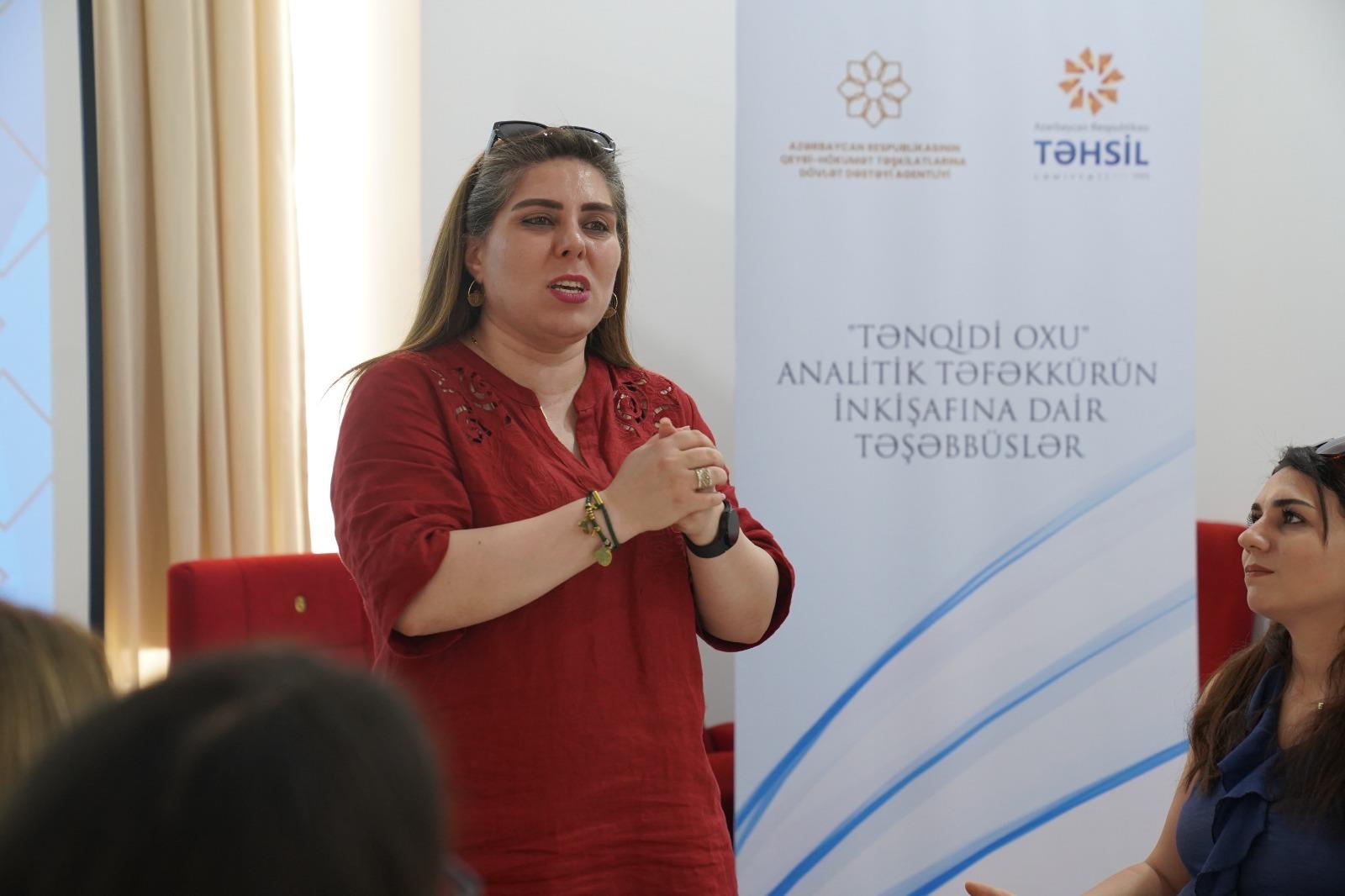 Sumqayıt Dövlət Universitetinin baş müəllimi Aynurə Bağırova “Tənqidi oxu strategiyaları və analitik yanaşma metodları” mövzusundakı təlimində tənqidi oxu bacaıqlarının inkişafında istifadə edilən elmi-metodoloji yanaşmaları, onların üsul və nəticələrini seminar iştirakçılarının diqqətinə çatdırıb.