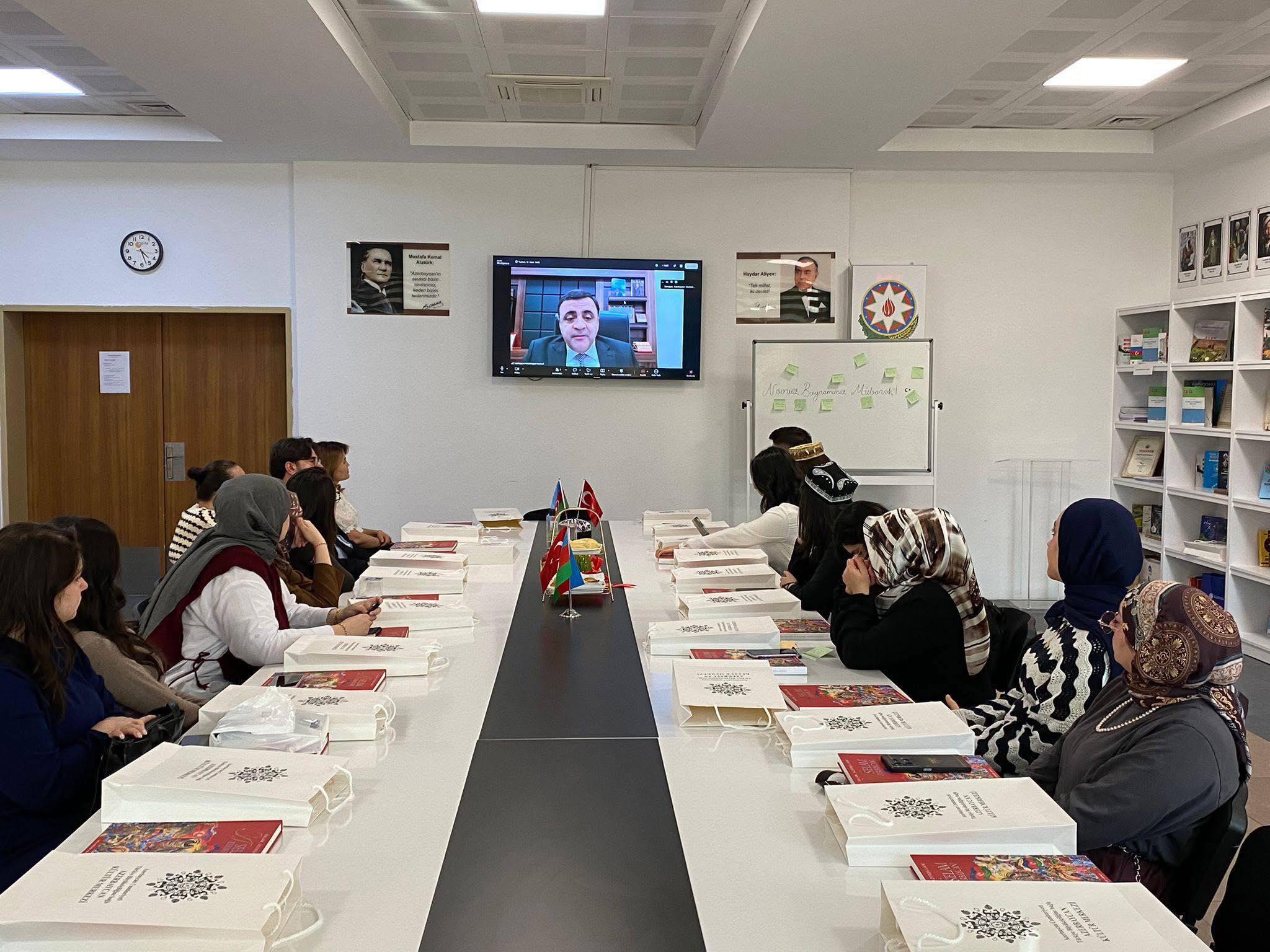 Sonra dərsdə Türkiyədəki Azərbaycan Mədəniyyət Mərkəzinin direktoru Samir Abbasov onlayn çıxış edərək tələbələri bayram münasibətilə təbrik edib. O, Novruz bayramının min illərlə xalqımızın mədəniyyətində xüsusi yer tutduğunu, zəngin ənənə və dəyərləri özündə yaşatdığını və ən qədim bayramlarımızdan biri olduğunu qeyd edib. S.Abbasov bayramın xalqımızın min illərlə yaşatdığını, onun baharın gəlişi, təbiətin oyanışı, yenilənmə və dirçəlişi simvolizə etdiyini vurğulayıb. Mərkəz direktoru qədim bayramımız olan Novruzun Azərbaycanda, Türk dünyasında geniş şəkildə dövlət səviyyəsində qeyd olunduğunu bildirib.
